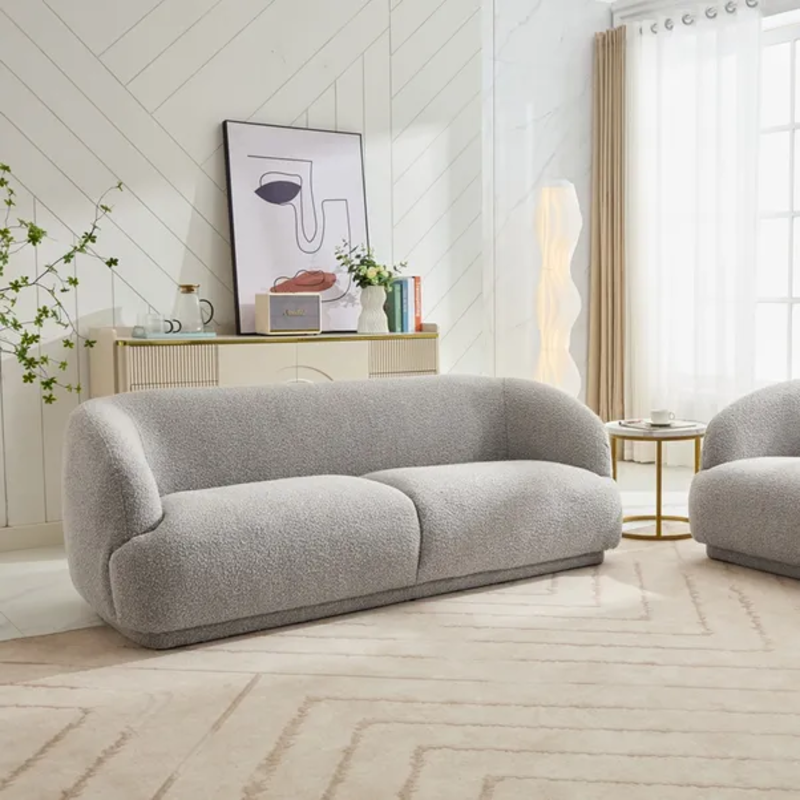 The Aria 3-seat sofa is a softly sculpted, contemporary piece defined by its generous curves and inviting proportions. Upholstered in a textured, bouclé-style fabric, it has a plush, tactile finish that adds warmth and visual depth. The rounded arms flow seamlessly into a low, curved backrest, creating a cocooning silhouette, while the deep, cushioned seat offers a relaxed yet supportive sit. Its clean base and absence of visible legs give it a grounded, modern feel, making the Aria ideal for calm, design-led interiors that favour comfort without sacrificing style.