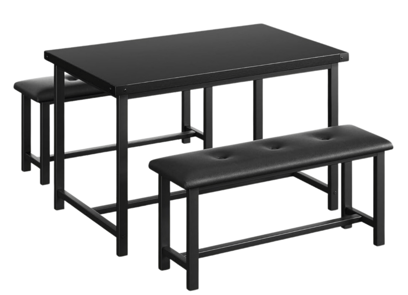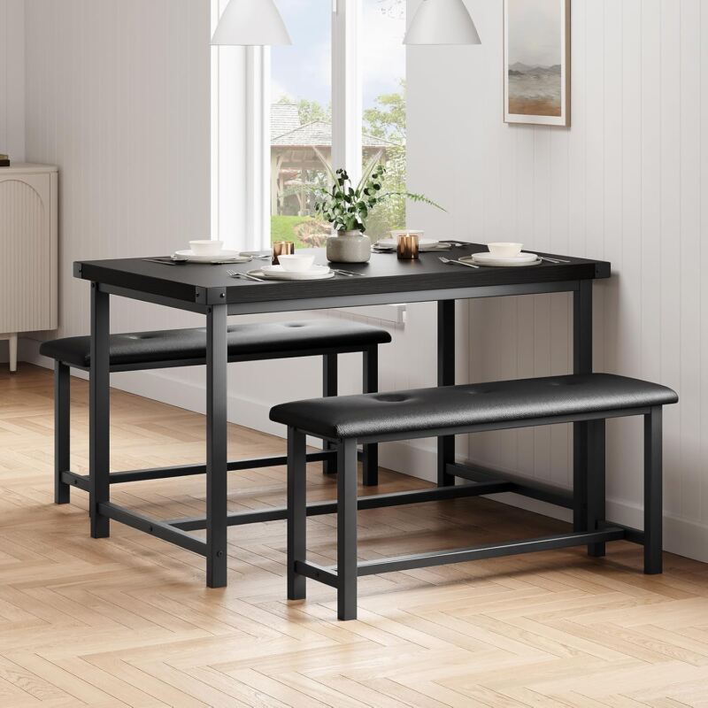 The Infinity Dining Table & Bench Set is a stylish, space-saving solution that pairs industrial design with modern practicality. It features a sleek rectangular table with a wood-effect top and sturdy black metal frame, complemented by two padded benches upholstered in smooth black faux leather with subtle button detailing. Both benches conveniently slide beneath the table when not in use, creating a clean, compact profile that’s perfect for apartments, studio spaces, or contemporary homes seeking a smart, minimalist dining setup.