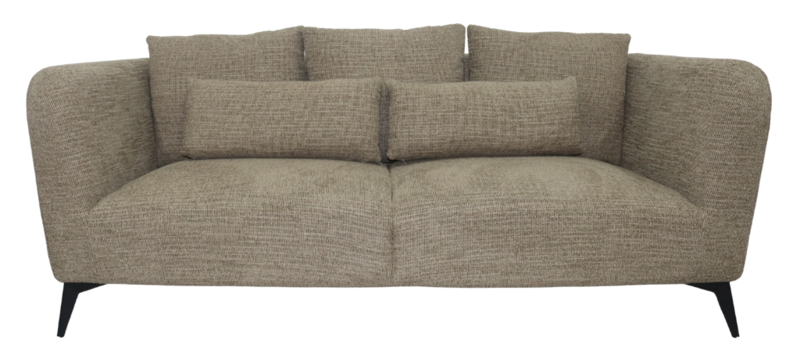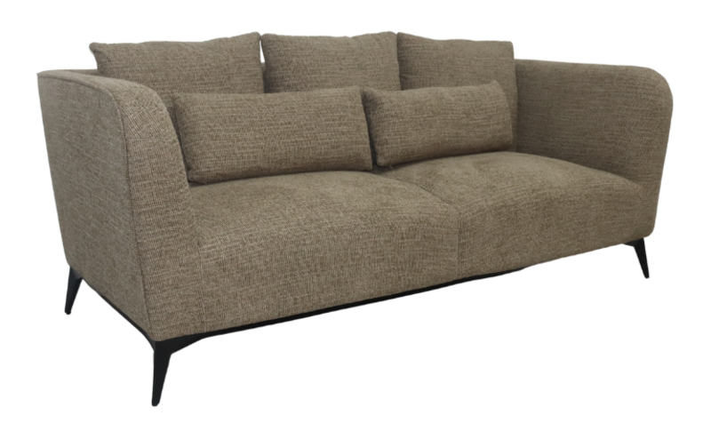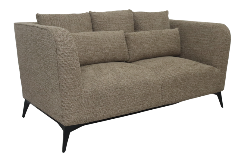The two-seater Langdale sofa offers a modern, understated design with a generous, relaxed feel, upholstered in a neutral light olive textured fabric that suits a wide range of interiors. Its wide, boxy silhouette is softened by deep seat cushions and supportive back cushions, complemented by slim rectangular scatter cushions that add comfort without cluttering the look. Low, gently angled arms create an inviting, lounge-style profile, while the slim black legs lift the sofa subtly off the floor, giving it a contemporary finish that works equally well in modern living spaces and refined rental interiors.