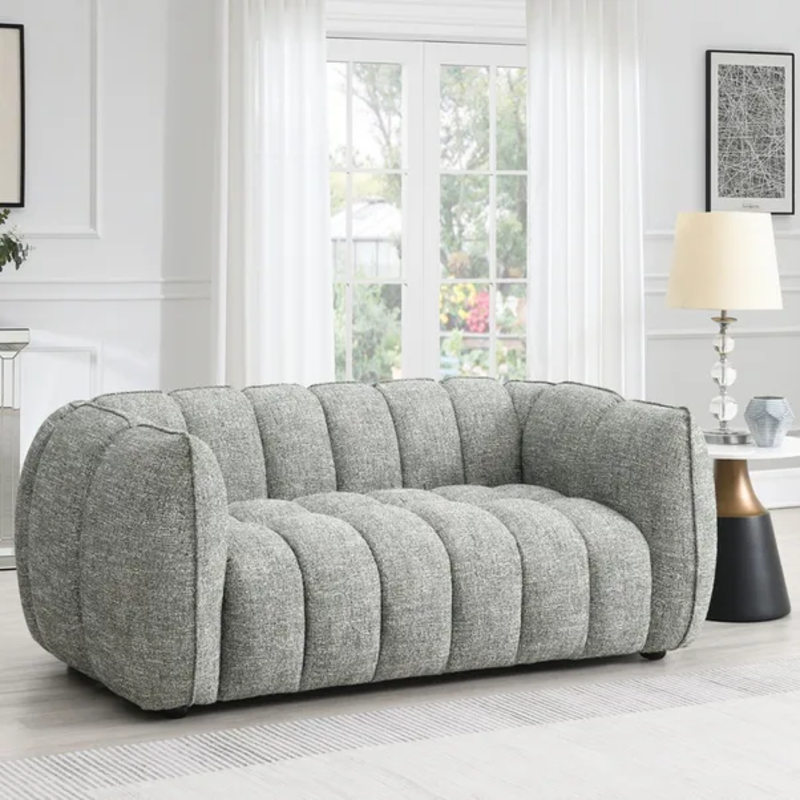 The Oakcrest 2.5-seat sofa is a bold, contemporary statement piece characterised by its deep channelled upholstery and generously padded form. Wrapped in a soft, textured fabric, it features pronounced vertical stitching across the seat, back, and arms, creating a structured yet inviting look. The wide, rounded arms and low backrest enhance its relaxed, lounge-style comfort, while the compact, grounded profile gives it a modern, design-led presence. Comfortable and visually impactful, the Oakcrest 2.5 is well suited to stylish living spaces that balance comfort with strong architectural detail.