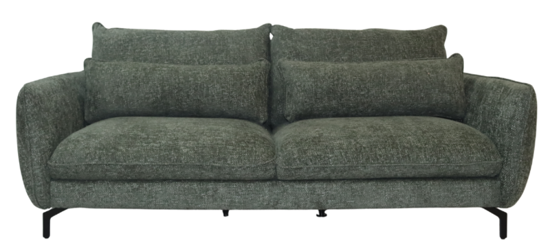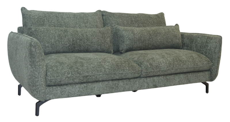 The Ronda 3-seat sofa is a contemporary, well-balanced design with gently rounded arms, deep cushioned seating, and supportive back cushions that create a relaxed yet tidy silhouette. Upholstered in a textured olive green fabric, it adds warmth and depth while remaining versatile for modern interiors, and slim black metal legs lift the frame to give it a light, modern feel and practical clearance underneath—making it ideal for contemporary homes, rental properties, and build-to-rent schemes.