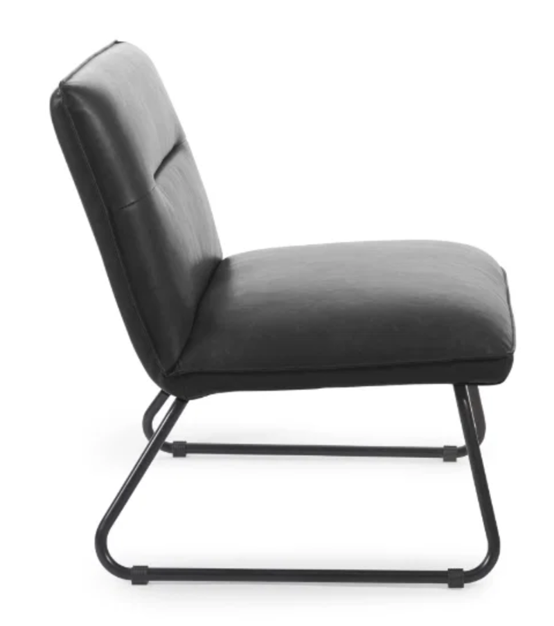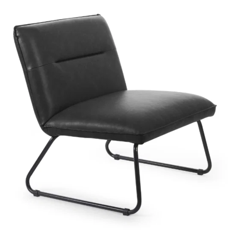 The Saxton Feature Chair is a contemporary accent piece that combines minimalist design with everyday comfort. Upholstered in smooth black faux leather, it features a gently curved, low-profile backrest with subtle stitched detailing for a refined finish. The generously padded seat offers a relaxed, lounge-style sit, while the sleek, powder-coated metal sled base provides both stability and a modern industrial edge. Its compact yet stylish form makes it ideal for living rooms, bedrooms, or reception areas, effortlessly adding a touch of understated sophistication to any space.